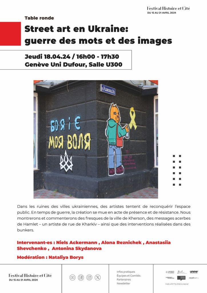 Dans les ruines des villes ukrainiennes, des artistes tentent de reconquérir l’espace public. En temps de guerre, la création se mue en acte de présence et de résistance. Nous montrerons et commenterons des fresques de la ville de Kherson, des messages acerbes de Hamlet – un artiste de rue de Kharkiv – ainsi que des interventions réalisées dans des bunkers.