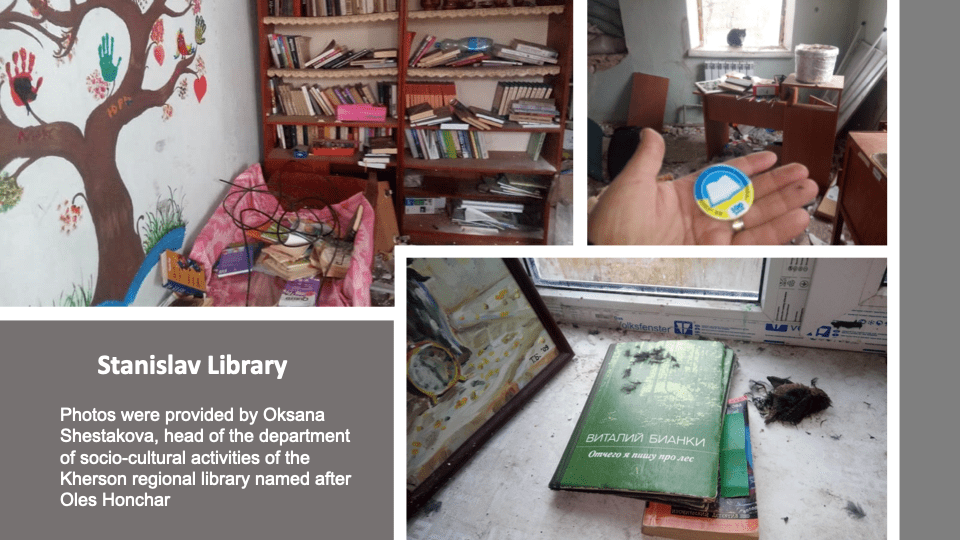 “On the night of August 2-3 2023, the Russian military fired aimed fire at the library. I emphasize that the shots were aimed, because there were three hits. They knew where they were shooting. I emphasize that this is the second shelling of this library. 30-40 % of the southern side is completely destroyed”, – from the interview with Oksana Shestakova, head of the department of socio-cultural activities of the Kherson regional library named after Oles Honchar.